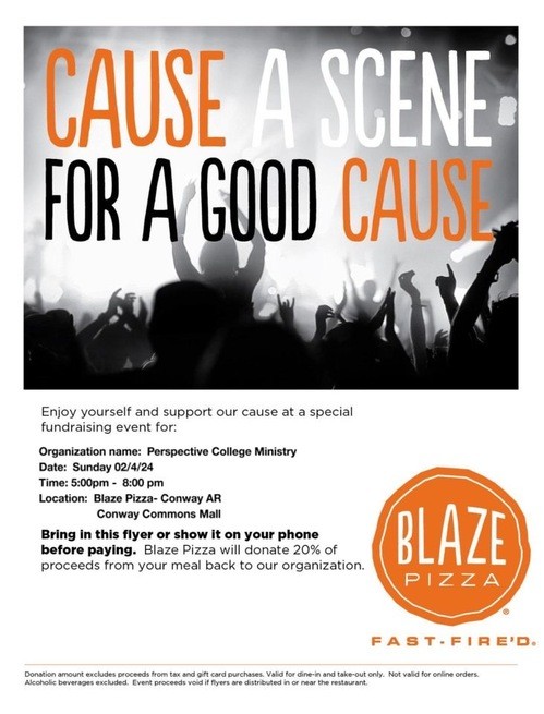 Perspective College Ministry is having a fundraiser on Feb. 4 at Blaze Pizza. Show this flyer when ordering and support our college students as they raise funds for summer missions!