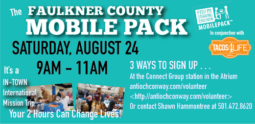 We will be preparing meal packs for Feed My Starving Children (Our shift will prepare 33,000 meals!) Children 7 years and older can participate with a parent/family member. Antioch's slot is Saturday, August 24 from 9-11 am. We will watch a 15-minute video telling us the why and the how of the project. We will spend an hour and a half putting the meals together. We will spend the remaining 15 minutes praying over the meals and the people they will benefit.